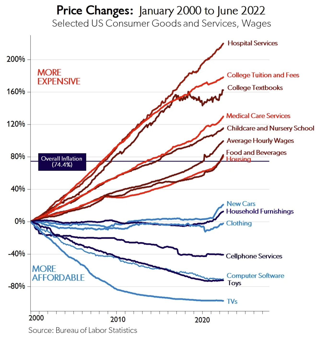 但在很多方面,科技并没有连续地“重新定义”我们的基本需求。我过去分享下面这张图表,但我在今天的文章中再次分享它,是因为它更新了截至 2022 年 6 月的数据。这张图表追踪绘制了自本世纪初以来美国消费品和服务价格的变化趋势。