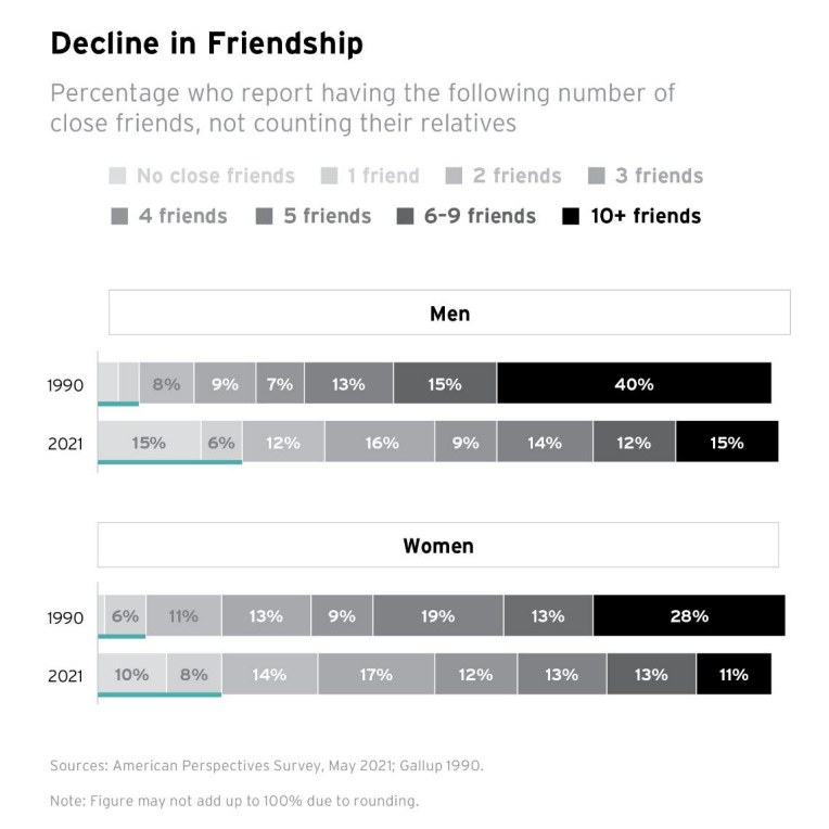 前不久,在《10 张图里看世界变迁:从越连接越孤独到 ChatGPT》一文中,我分享了下面这张反映“友谊少了”的图表。