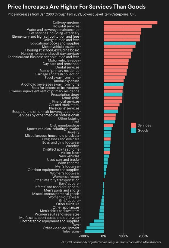 托儿所、教育和兽医等服务的价格都上涨了 100% 以上,而衬衫、相机和家电等商品的价格则在下跌。