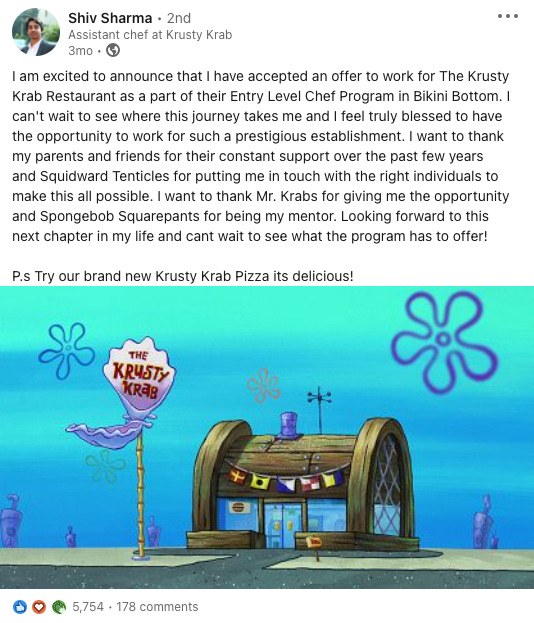 一位名叫 Shiv Sharma 的领英用户更新自己入职蟹堡王快餐店的动态。