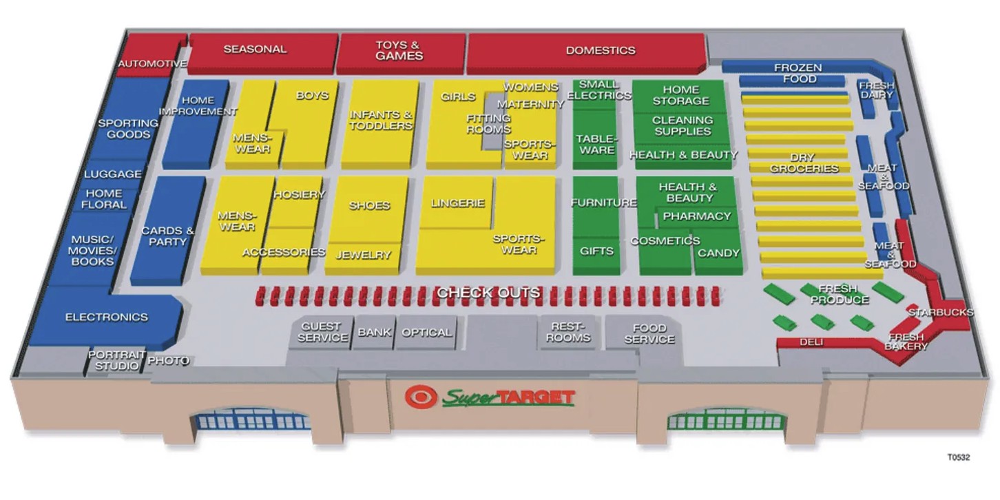 大多数商店都会引导顾客逆时针行走。例如,在下图中的塔吉特商店里,顾客进店后看到的都是日常必需的食品,然后才是其他类型的商品。