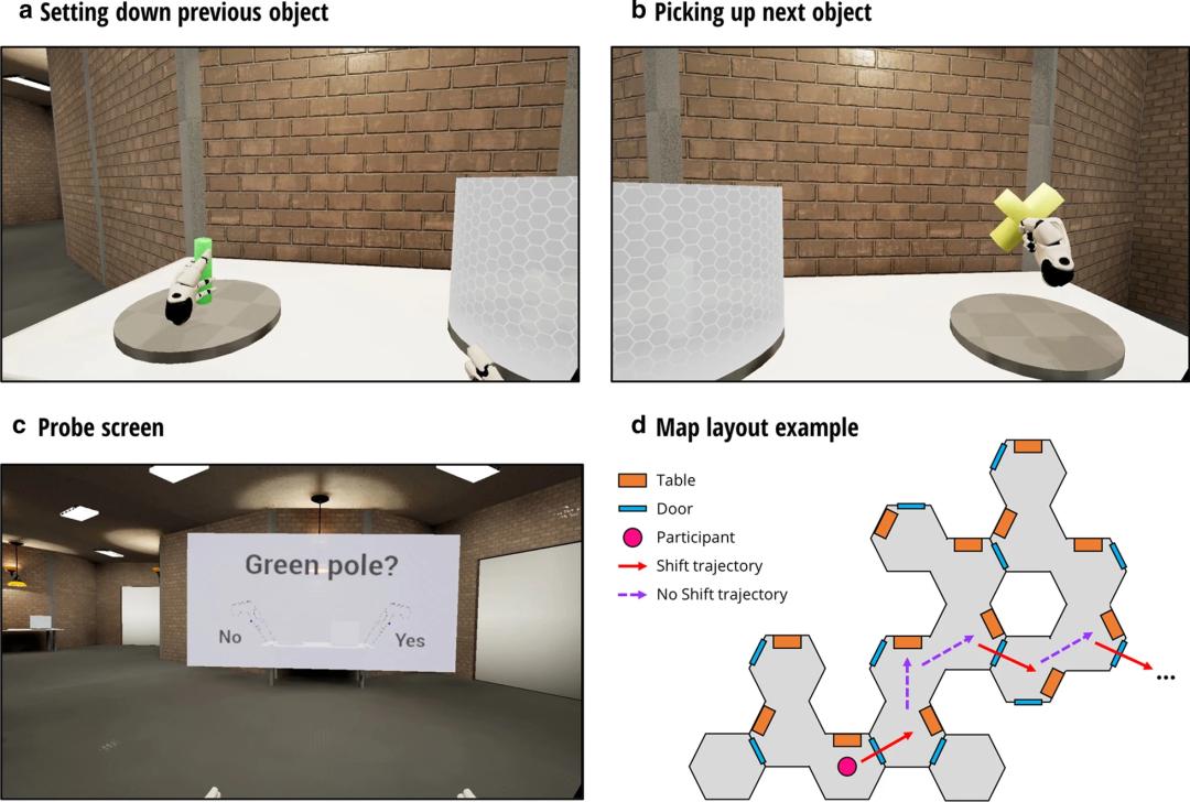 一项研究中,研究人员排除了现实世界中的其他干扰因素,让参与者戴上VR眼镜进入由一系列房间组成的虚拟世界。在这个世界里,每个房间都有一张桌子,上面放着一个物体。参与者的任务是在不同的桌子之间移动,将每个物体从上一张桌子移动到下一张桌子(存在跨房间转移和不跨房间转移)。在移动的过程中,会有探测器对参与者进行提问,例如刚刚放在桌子上或者刚刚拿起来的物体是什么形状和颜色。参与者的描述五花八门,要么与他们携带的物体相一致,要么与上一张桌子上的物体相一致,要么凭空捏造出了一个物体及颜色。