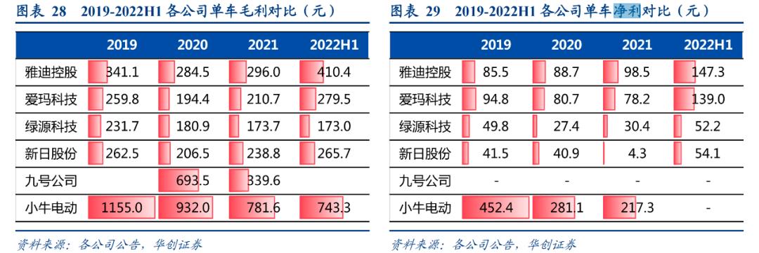 从单车毛利/净利数据可以看到,雅迪和爱玛在毛利相差巨大的情况下,单车净利却十分接近,说明后者更懂得怎么赚钱,也说明雅迪相对粗放的运营要接受挑战。同时,也要看到九号、小牛在毛利和净利上的巨大数字。