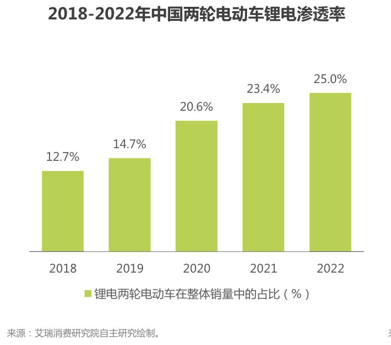 以锂电化为例,艾瑞咨询数据显示,2022年两轮电动车锂电的渗透率已经达到25%[6]。