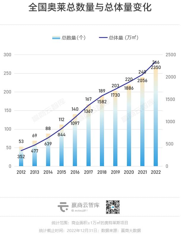 1、全国奥莱数量不足300个,2022年总体量2350万㎡