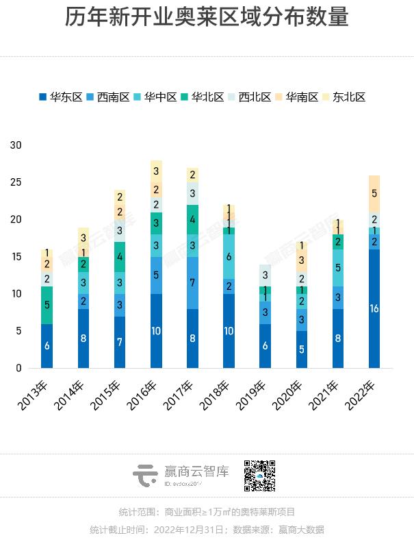 观察十年间新增奥莱的区域分布,可以看出,华东区一直是新开业奥莱的主力区,地位稳固,2022年新开奥莱项目高达16个;华北区新项目连续减少,2022年缺席;华南区2022年开出5个,创历史新高;西南区、华中区表现不稳,东北区长期缓慢。
