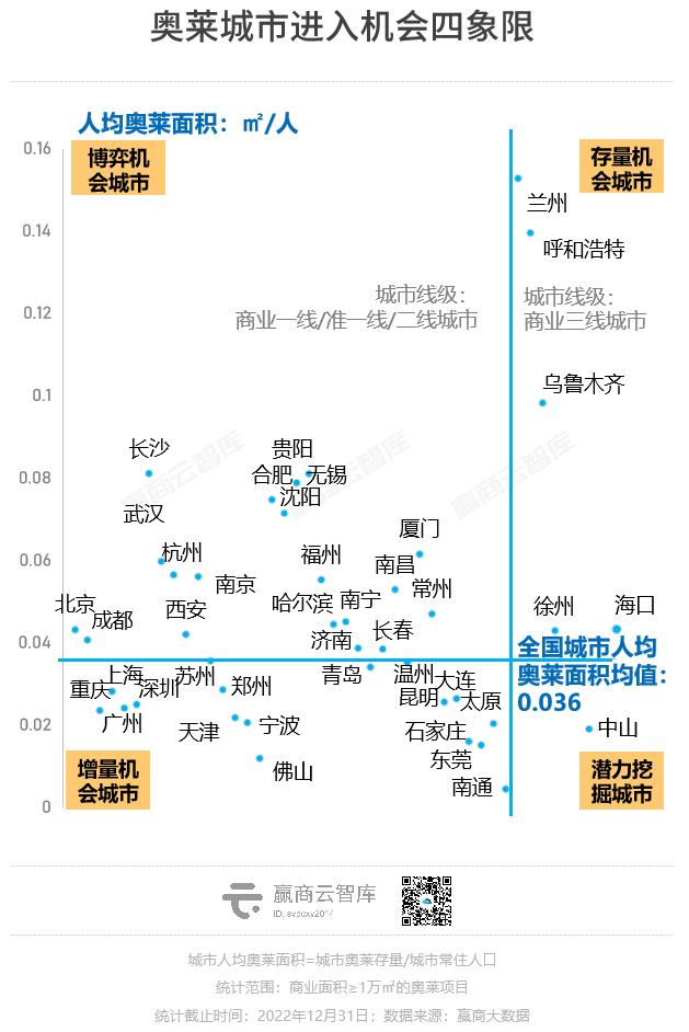 通过对人均奥莱面积的中位数和城市商业线级交叉分析,从供给和需求两方面,对40+个城市进行四象限分类,可由此推断不同城市市场进入机会的差异性。