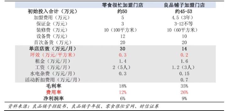值得关注的是,零食很忙毛利率虽然较低——门店综合毛利率18%左右,只有良品铺子加盟店的一半,但前者单店的坪效、运营效率显著高于良品铺子,费用率却不足后者二分之一。