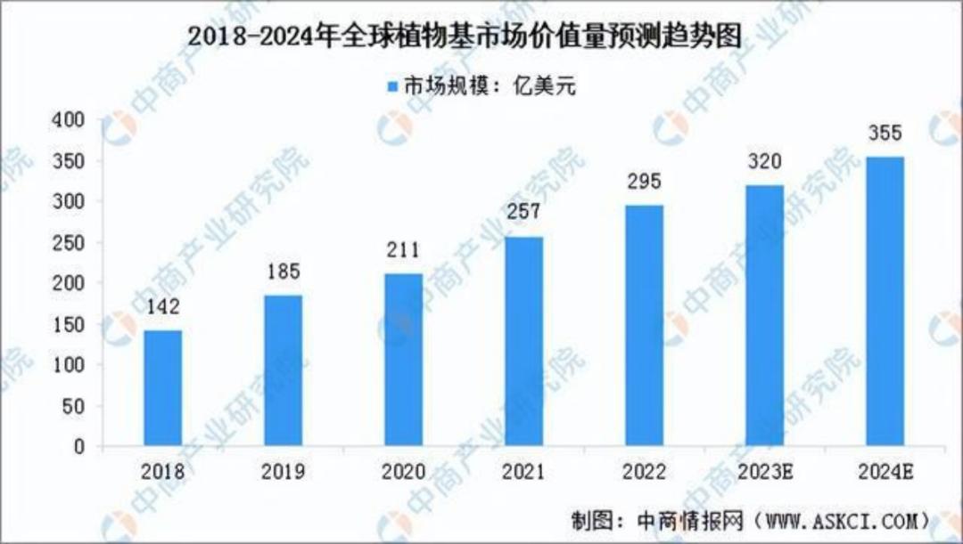 艾媒资讯数据显示,2019年全球植物基市场价值达185亿美元,较2018年增加了43.0亿美元,同比增长30.3%,预计2024年全球植物基市场价值将达到355.0亿美元。