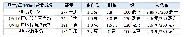 36氪将市面几款常见的产品进行对比,发现OATLY原味醇香燕麦奶的能量与脂肪含量仅略低于牛奶,却高于脱脂牛奶。蛋白质含量上,OATLY仅为牛奶的三分之一,价格则高出牛奶产品的两倍以上。