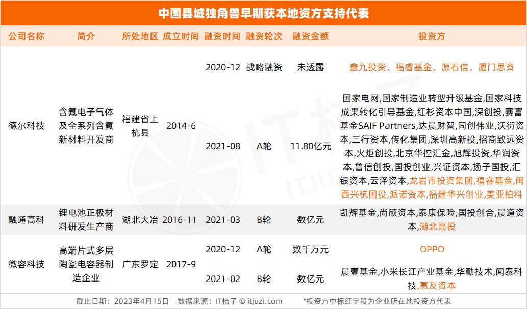 事实上,目前在县城成长起来的独角兽企业,多家企业在创业初期也都获得了本地投资方的支持。德尔科技第一笔融资,4 家投资方均为福建省本地机构/公司,之后龙岩市投资集团、闽西兴杭国投等本地国资机构又参与支持本土企业的成长。广东罗定的微容科技,A 轮融资投资方为广东省代表性知名企业 OPPO;湖北大冶的融通高科,早期的 B 轮融资中湖北高投参与投资。