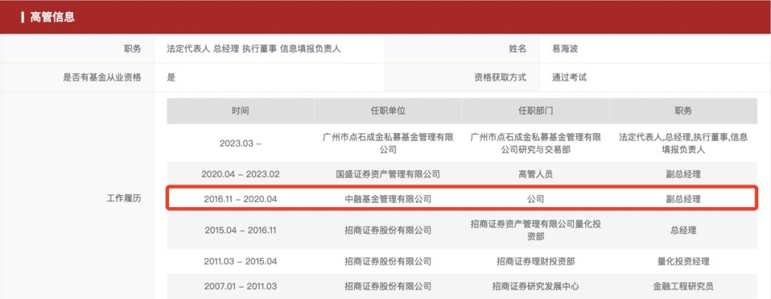 4月14日,在基金业协会备案的广州市点石成金私募基金管理有限公司其法定代表人、总经理兼执行董事易海波也是公募基金从业多年的副总经理级高管。