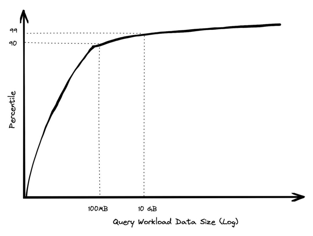 几年前,我对 BigQuery 的查询情况做了一个分析,分析了每年花费超过 1000 美元的客户。90% 的查询处理的数据小于 100MB。我用了很多不同的分析方法,以确保结果不被进行了大量查询的几个客户的行为所扭曲。我还把仅对元数据的查询剔除了,这是 BigQuery 中不需要读取任何数据的部分查询。到达 GB 这个量级的非常少,极少量的查询能达到 TB 级。
