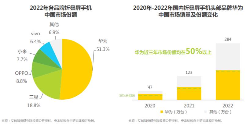 据艾瑞咨询发布的《2023年中国折叠屏手机市场洞察报告》显示,目前国内市场占有率前三的品牌是华为、三星、OPPO,不仅推出了左右对折的大尺寸折叠屏,还推出了上下对折的小尺寸折叠屏。