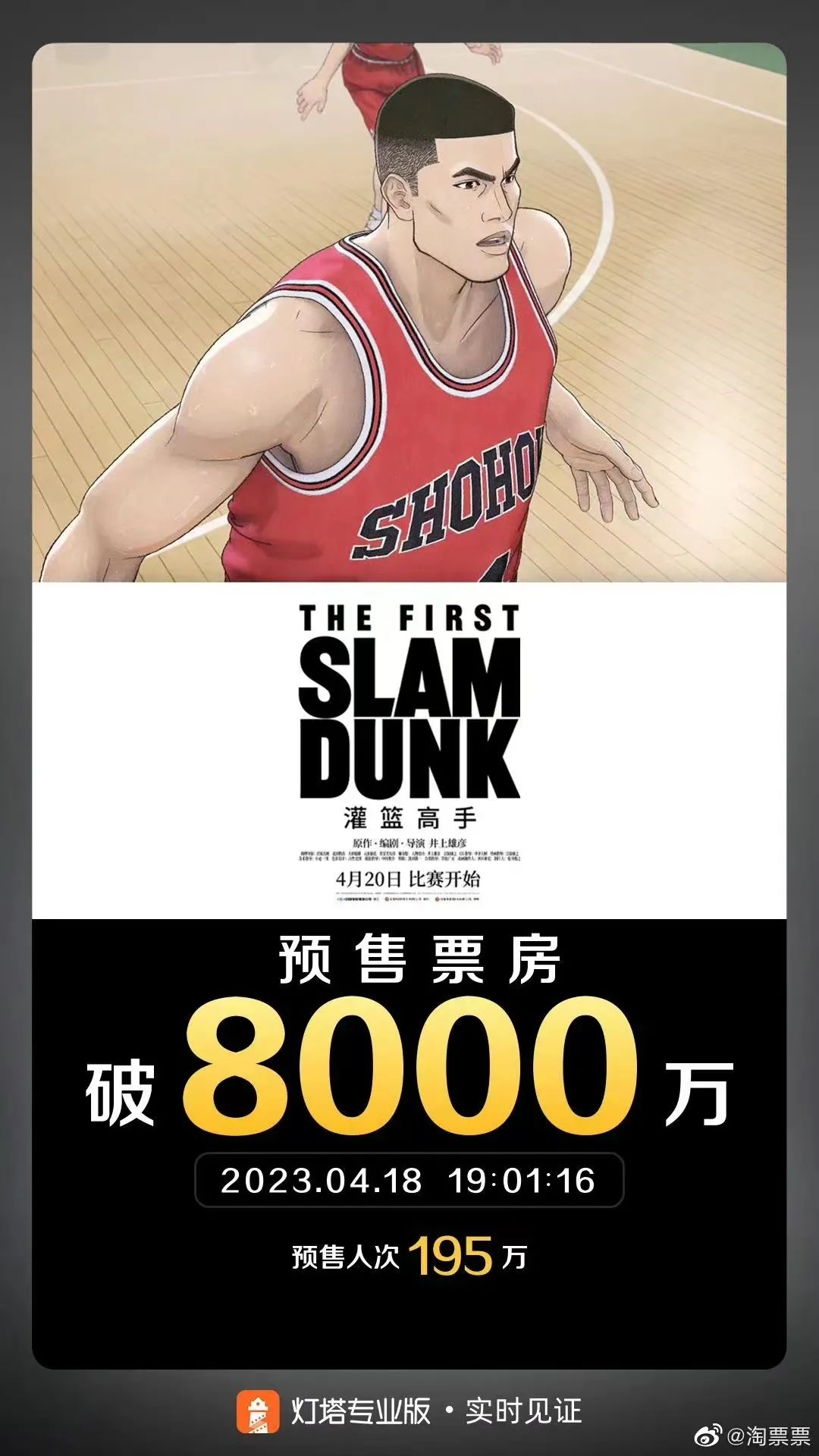 据灯塔专业版实时数据,截至4月18日19时01分,影片《灌篮高手》预售总票房突破8000万,预售人次195万。作为现象级的经典IP,《灌篮高手》在日本上映后连续八周取得周末电影票房冠军。