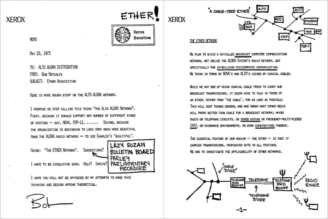在备忘录中,梅特卡夫绘制了以太网的工作原理草图。他提出:“参与的站点,如AlohaNet或ARPAnet,会注入它们的数据包,它们以每秒兆比特的速度传播,会有碰撞、重传和后退。”
