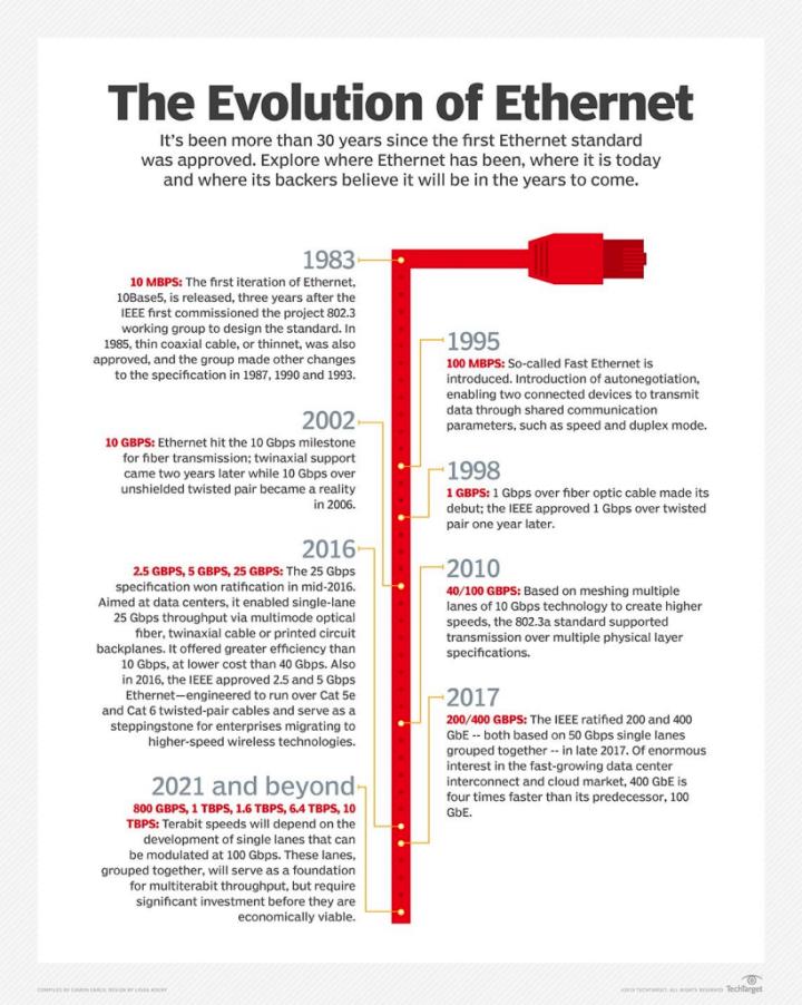 如今,以太网仍然是全球有线网络通信的主要标准。它的处理数据速率,从2.94Mbps、10Mbps,一路升级到了现在的400Gbps、800Gbps,甚至1.6Tbps。