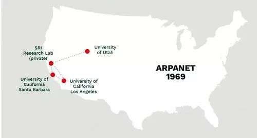 1969年,美国国防部推动建设的ARPANET(阿帕网,也就是互联网的前身)正式诞生,将四所名校的大型计算机进行了互联。