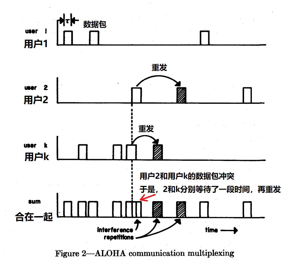 在ALOHAnet中,数据以微小数据包的形式传输。 它并没有尝试避免数据包之间的冲突。相反,任何因冲突而导致消息丢失的用户,只需在随机的时间间隔后,重新尝试发包,即可。