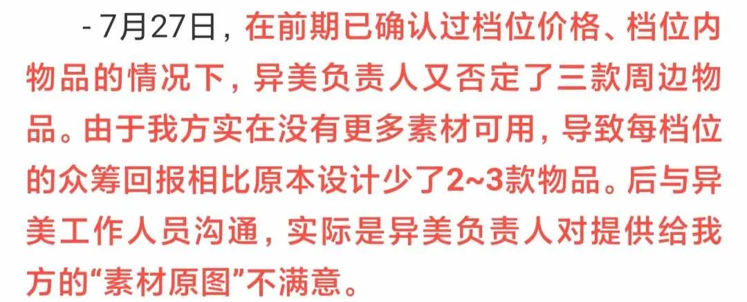 对于众筹引发的争议及亏损,热脉回应称,在前期已经确认过产品及定价的情况下,异美又否掉了热脉三款周边设计,导致众筹回报受到影响。热脉补充,异美方工作人员后来表示,否掉部分设计,是因为异美负责人对于先前提供给热脉的“素材原图”不满意。