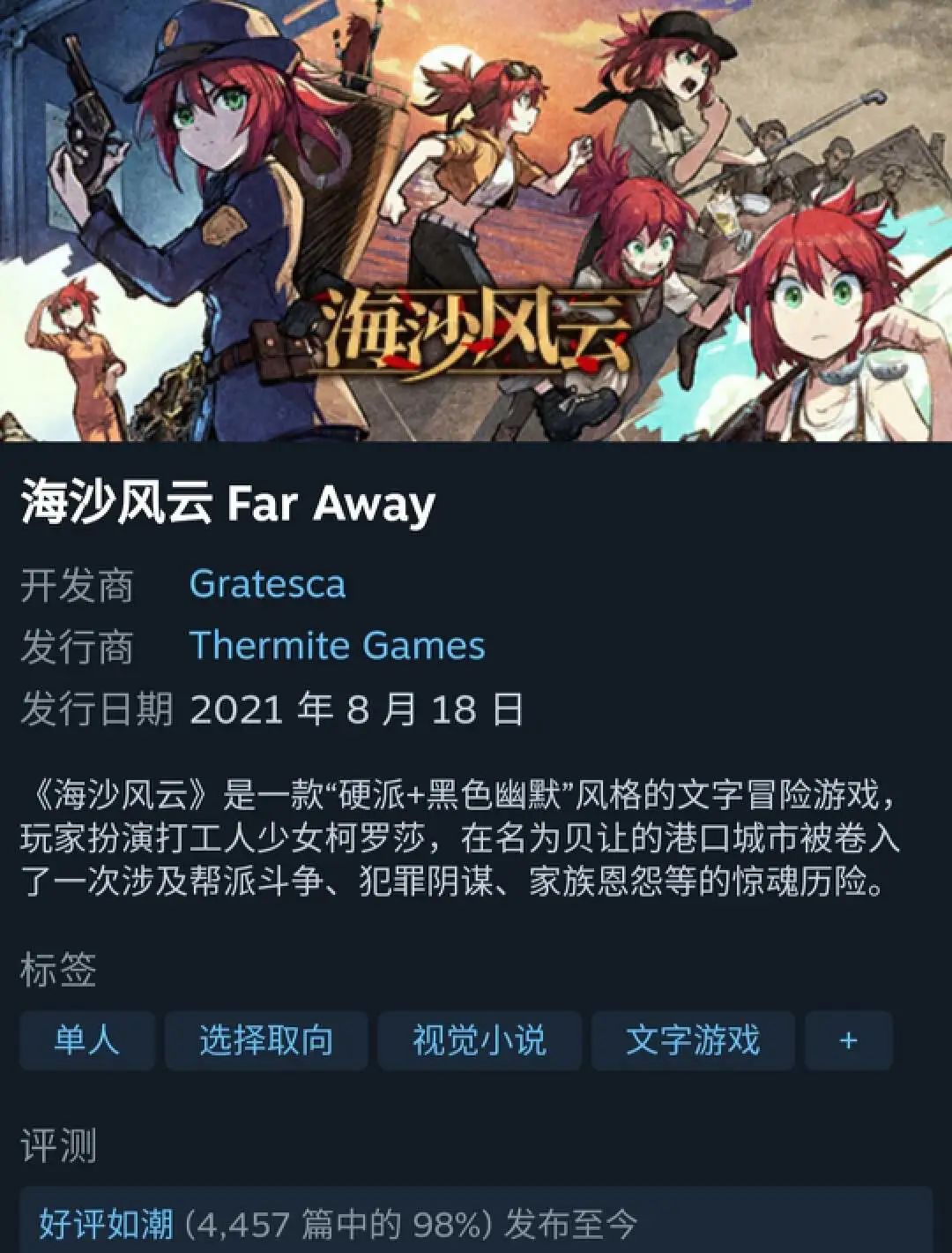 《海沙风云》于2021年8月上架Steam,原本由心动负责发行 ,且已在2021年7月拿到版号 ,但后来发行商换为热脉,移动端版本也再无消息。根据异美的说法,2021年9月,其与热脉对该游戏合作发行事宜达成共识,签订了合同。