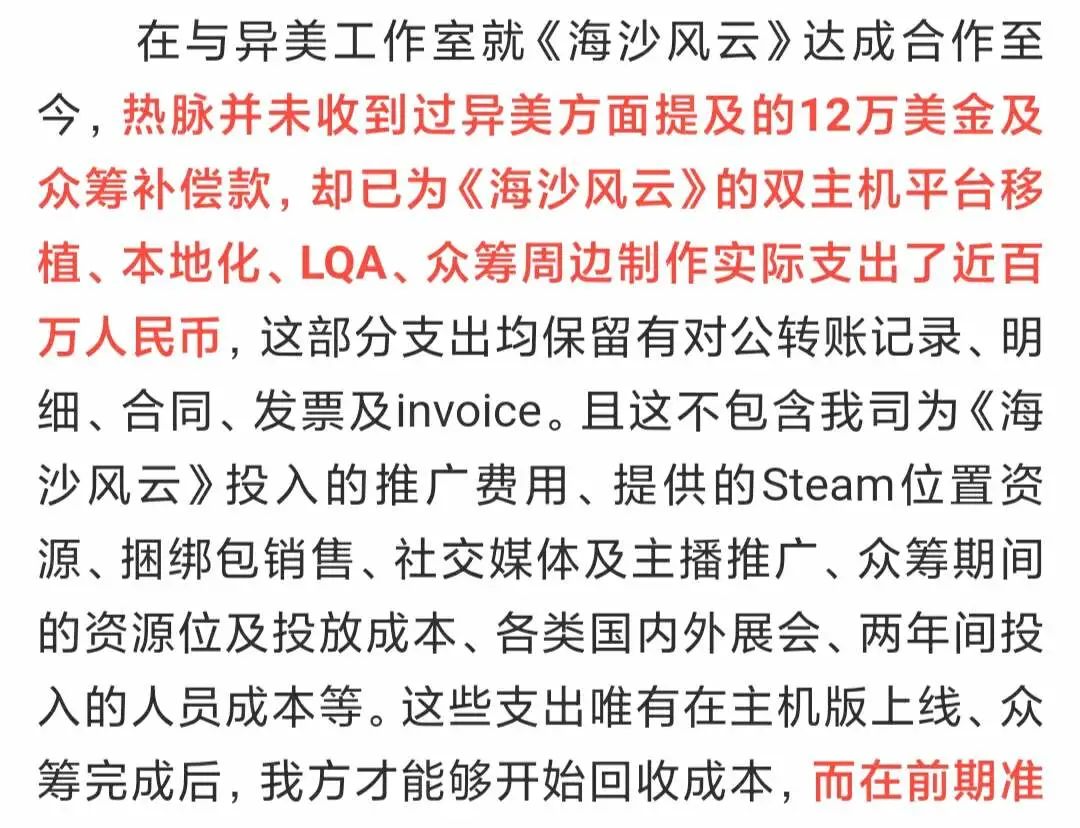 对此,热脉回应表示,公司确实已经在《海沙风云》上支出了近百万人民币,且有对应的明细、发票等记录。热脉补充,在《海沙风云》主机版上线、众筹完成后,热脉才能开始回收成本,这意味着目前公司未能从该项目中获利。