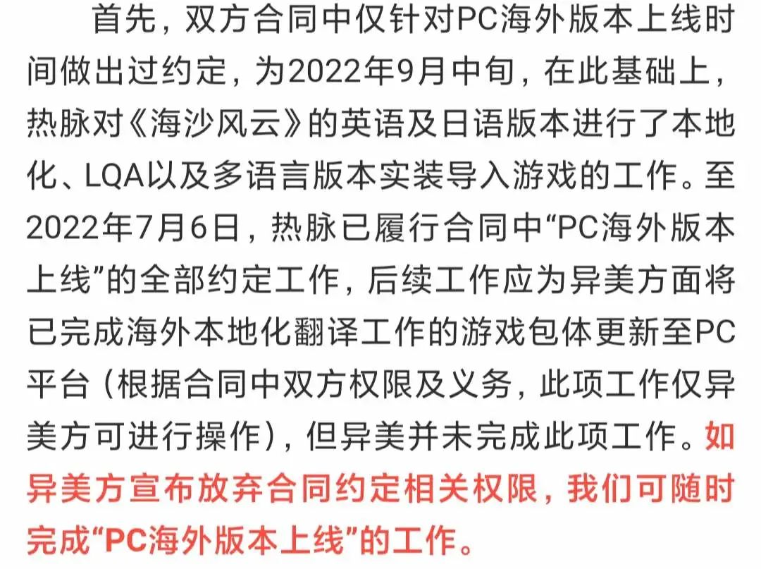 据热脉回应,双方确实在合同中约定过PC海外版上架时间,但热脉已在2022年7月完成相关工作,后续应由异美将已完成本地化的包体更新至PC平台。