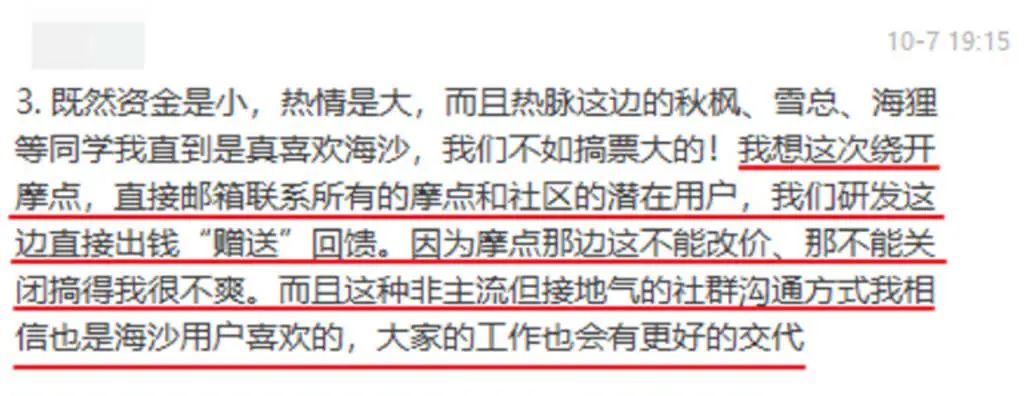 在此期间,异美曾向热脉提议停止众筹,绕过摩点,直接联系摩点及社区的潜在用户,向他们免费赠送物料。但热脉表示其员工已在众筹上花费大量精力,此时停止会影响士气,且会影响其与摩点的合作关系,也会让参与众筹的玩家感到疑惑,最终拒绝了异美的提议。