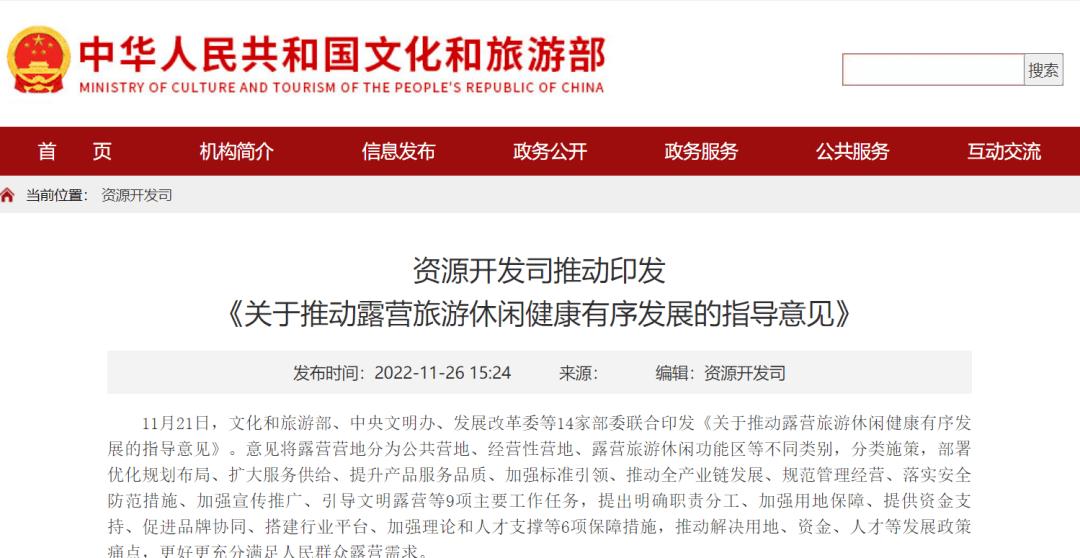 为推进行业健康有序发展,2022年11月,文化和旅游部、中央文明办、发改委等14部门联合印发了《关于推动露营旅游休闲健康有序发展的指导意见》,提出推动公共营地建设,扩大公共营地规模,提升服务质量。在符合相关规定和规划的前提下,探索支持在转型退出的高尔夫球场、乡村民宿等项目基础上,发展露营旅游休闲服务。