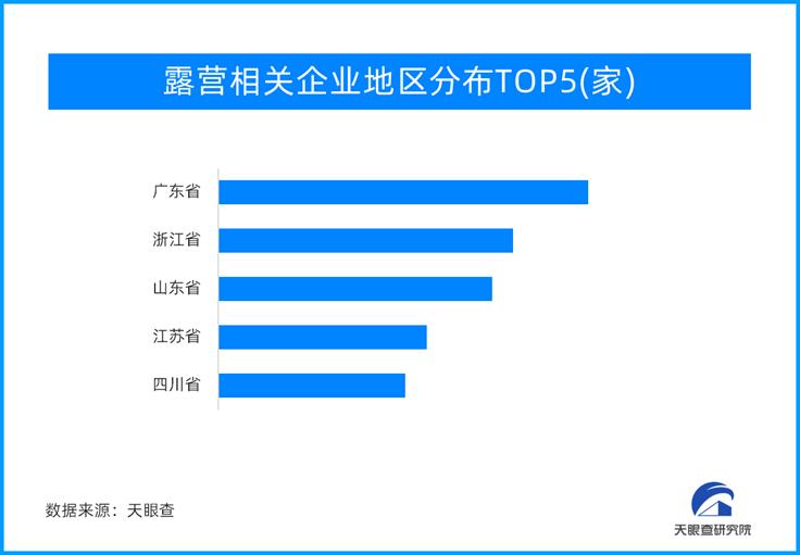 天眼查数据显示,2022年,新增注册露营企业3.3万余家,新增注册企业增速达39.6%。截至目前,露营相关企业达12.1万余家。从地域分布看,广东以1.3万余家位列区域首位;浙江、山东分列第二、三位,分别拥有1万余家以及9,620余家;从成立时间看,44.6%的相关企业成立于1-5年内,成立于1年以内的相关企业占比27.9%。