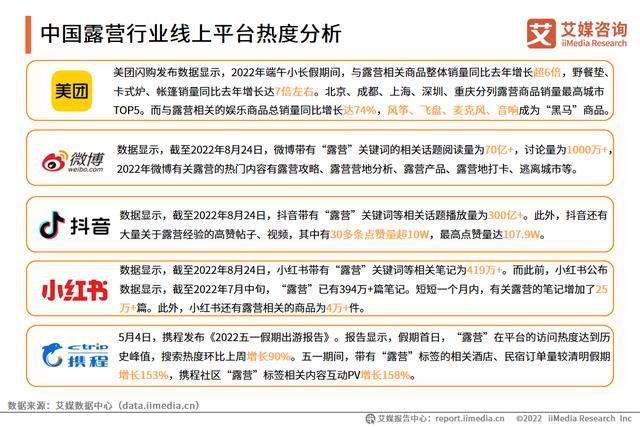 艾媒咨询数据显示,露营相关产品、内容、话题在美团、微博、抖音、小红书、携程等平台快速增长。截至2022年8月24日,抖音平台“露营”话题播放量超300亿次,小红书平台“露营”相关笔记超419万篇。