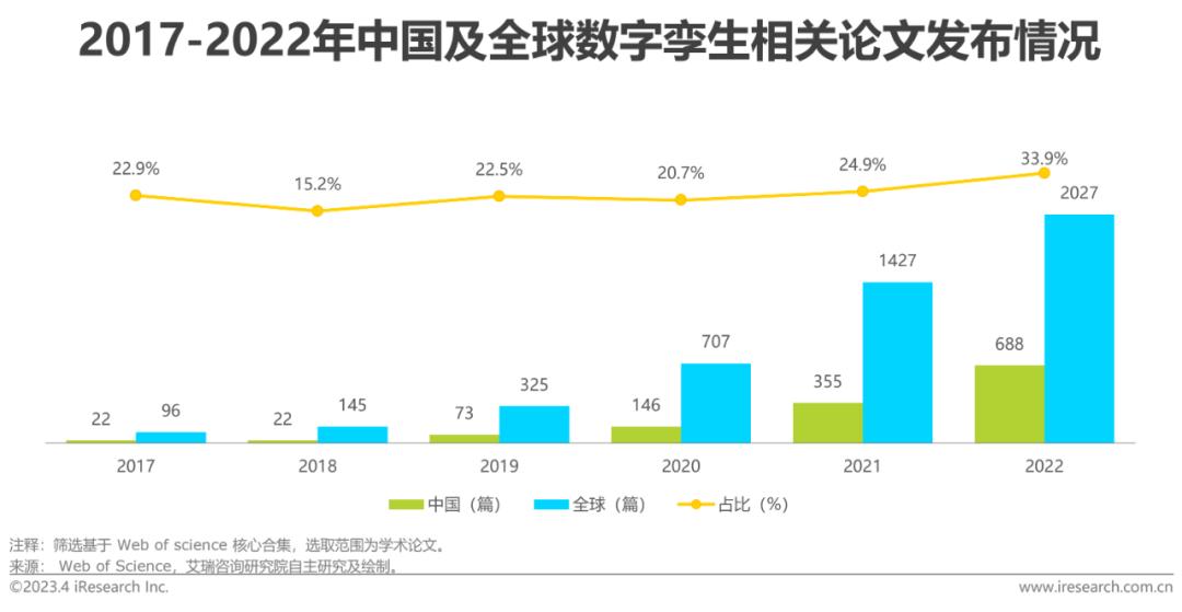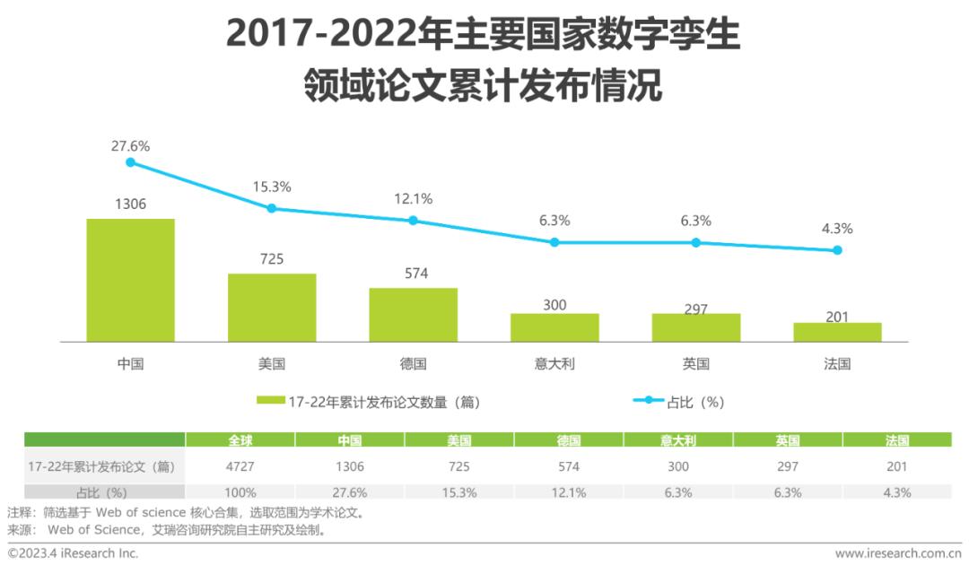 近年全球学术界对数字孪生的研究势头活跃,全球论文发布数量呈现逐年增长趋势,自2019年以来研究热度持续高涨。根据Web of Science数据,2022年全球共发布与数字孪生相关论文数量为2027篇,同比增长42.1%。我国论文发布数量与全球趋势保持一致,且占全球比重逐年上升,2022年中国共发布688篇数字孪生相关论文,占全球33.9%。从总量上看,2017-2022年间,全球共累计发布4727篇数字孪生相关论文,其中中国(1306篇,27.6%)、美国(725篇,15.3%) 、德国(574篇,12.1%) 、意大利(300篇,6.3%)等国家是论文产出最多的国家。