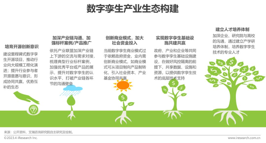 数字孪生是一个涉及多环节、多领域、跨部门的复杂系统工程,需要各行业合作,协同创新,提供广泛的技术与数据支持。通过构建协同共赢、开源创新的数字孪生产业生态,促进物理世界和数字世界的深度融合,驱动更多行业对数字孪生的应用,推动技术的发展,助力各行业加速向数字化转型。构建数字孪生技术产业生态应包括以下几方面:1)培育开源创新意识,激发从业者开源创新活力;2) 加深产业链沟通,加强数字孪生项目标杆案例、产品的推广;3)创新商业模式,加大资金投入;4)数字孪生基础设施共建共赢;5)建立数字孪生技术的人才培养机制。