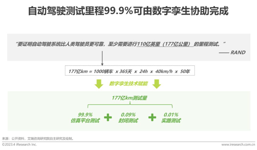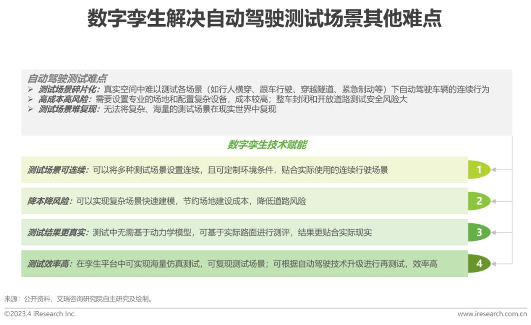 自动驾驶行业内一直有“里程测试需达到177亿公里,自动驾驶可靠性才能达到相对理想的置信区间”的观点,然而实现该目标需投入巨额的时间和金钱,很大程度限制了自动驾驶发展。随着数字孪生、仿真等技术发展,业内普遍采取 “99.9%+0.09%+0.01%”解决方案的共识,通过数字孪生技术赋能,保障自动驾驶研发测试算法的演进。除此之外,还面临测试场景碎片化、成本高企风险大、难以复现测试场景的挑战,将数字孪生技术应用在自动驾驶研发测试上,具有测试场景持续化,节省测试场景建设成本,同时提高开发迭代效率等优势。