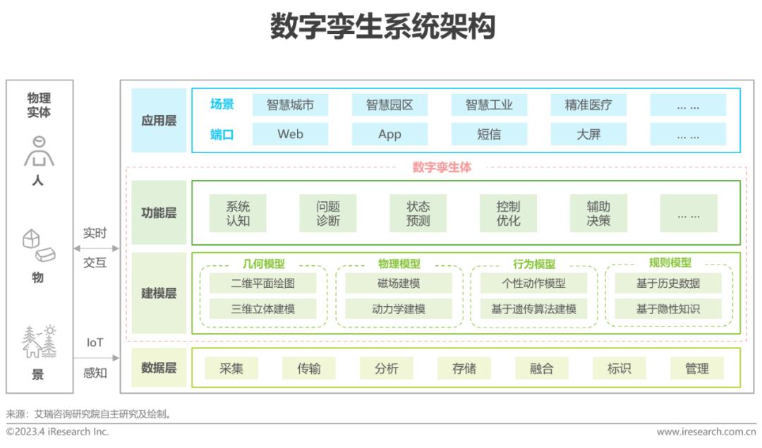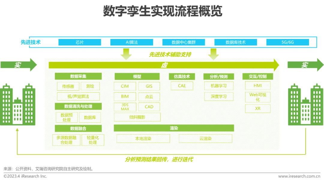 数字孪生通过构建数字孪生体并对其全生命周期进行模拟分析,为优化决策提供依据,这需要数据能力与建模能力作为底层支持。数字孪生通过传感器等媒介,采集人、物等物理实体的数据,通过物联网技术传输实时状态数据,最终在内部进行数据标记与管理,构成底层数据池。具有底层数据做支撑后,数字孪生将基于现实世界建模,构建一个与现实世界基本一致的数字世界,再通过仿真等技术模拟物理世界的规律,实现状态预测、问题诊断等功能,反馈现实世界决策。