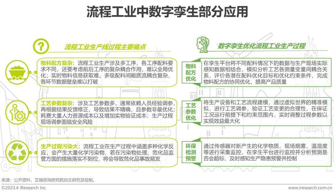 流程工业包括能源、化工、制药、冶金等细分行业,这类行业在生产过程中设涉及多种复杂的物理化学反应,各流程工序间耦合强,因此面临缺乏最优物料配方方案导致能耗物耗高,资源利用效率低,工艺调参复杂导致生产成本高企,生产过程环保措施不到位导致环境污染等问题。通过数字孪生技术可以帮助流程工业完成优化物料配方、工艺参数以及环保检测预警等工作。