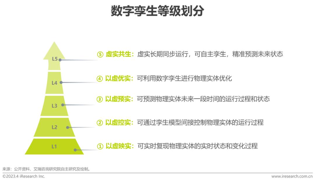 数字孪生指将物理实体镜像映射到虚拟空间,生成一个“数字双胞胎”,在虚拟空间中的克隆体可以通过物联网实现数据实时双向互联互通,从而反映对应物理实体的全生命周期过程,在整合底层数据信息的基础上进行仿真预测,为优化决策赋能。同样是在数字空间构建产物,数字孪生并不等于元宇宙,数字孪生是元宇宙的重要技术基础之一,二者的区别在于前者强调复现物理对象的状态使其更加贴近现实,更多使用于B端领域,后者强调人及其感知,更加贴近C端消费场景。另外根据复杂程度,数字孪生可以分成5级,级别越高,数字孪生越强大。