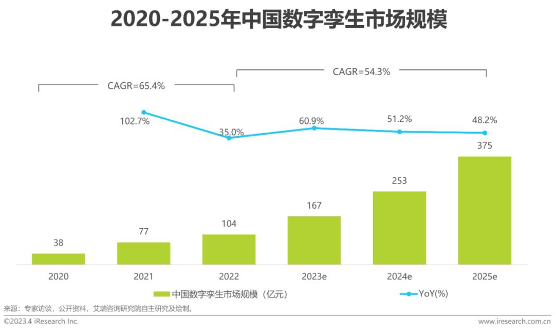 2022年中国数字孪生市场规模为104亿元,同比增长35.0%,2020-2022年CAGR为65.4%。随着各行业数字化转型的推进,数字孪生渗透率也将上升,推动国内未来数字孪生市场规模增长,预计2025年国内市场规模将达375亿元, 2022-2025年CAGR为54.3%。