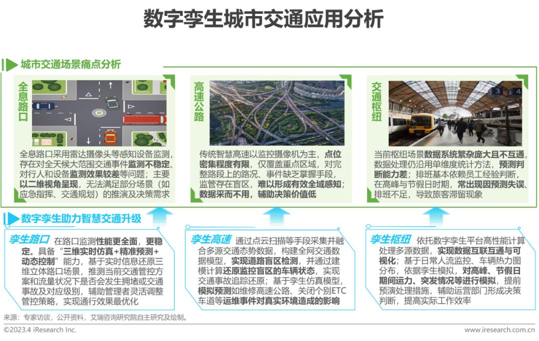 交通行业数字化转型已发展多年,道路交通的运行效率显著提升,但仍存在部分问题有待解决。随着数字孪生技术的兴起,基于数字孪生城市的虚拟空间,结合交通信息数据和高精度地图,构建具备实时性、可模拟、可预测、并可控制物理实体的新型智慧交通体系,将是未来交通发展新方向。在智慧城市交通场景下,数字孪生技术可应用至全息路口、高速公路及交通枢纽(地铁、车站、机场等)三个子细分场景。