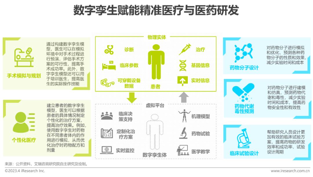 在医疗场景中,数字孪生可以帮助医生进行手术模拟与规划,提高手术成功率以及医生实操技能,同时还可以建立患者孪生模型,针对不同患者的具体情况给予不同的治疗方案,实现患者个性化治疗,不仅提高医疗质量和效率,同时也可以帮助患者更好地管理自己的健康。另一方面,在数字孪生也可赋能医药研发场景,研究人员也可在人体孪生模型中完成药物研发设计、人体药物代谢与毒性预测、临床试验等工作,进而实现药物研发高效化,降低研发成本和风险,提高药品的质量和安全性。