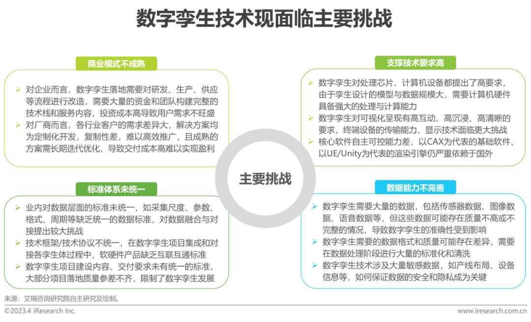 目前中国数字孪生行业现存挑战主要有四大挑战:厂商商业模式不成熟,主要体现在客户需求端较低迷,产品高定制化需求导致供给厂商盈利困难;其次是行业内缺乏统一的标准体系,数字孪生数据、产品、项目落地等标准体系有待完善;此外,数字孪生对高性能计算、显示技术等基础支撑技术要求较高,且基础软件和渲染引擎仍依赖国外厂商;第四点是数据能力方面,挑战体现在数据准确性无法保证,数据处理能力弱及可靠性低以及数据安全性易受攻击等。