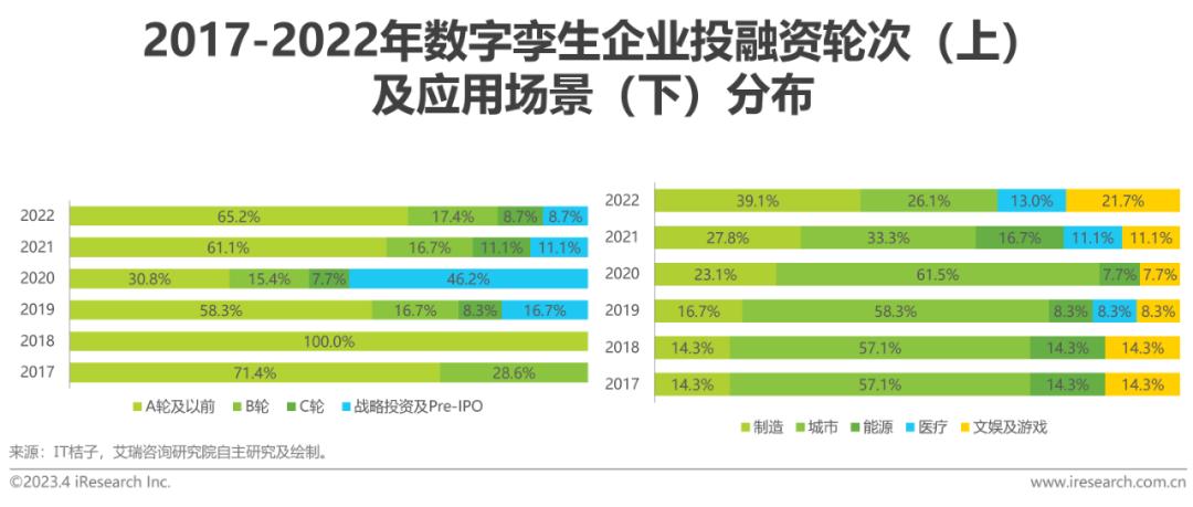 自数字孪生步入增长期,行业的相关投融资事件起数及融资规模整体趋势往上增长,根据IT桔子数据,2017年至2022年,国内数字孪生相关企业融资事件共计80起,融资总额82.6亿元。从融资热度角度,2022年处于快速发展期,融资金额在2021年相对回落后又持续走高,2022年攀升至25.4亿元。从融资轮次角度,主要以A轮及以前的相关事件为主,战略投资及Pre-IPO事件近年来频现。从应用场景看,城市作为数字孪生最重要的落地场景,近年来始终维持较高景气度,其次为制造。