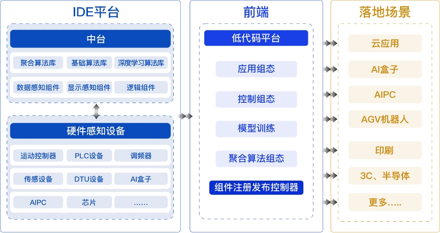 芯算一体的IDE平台上目前已汇聚了近500种算法,已完成了算法和芯片、工业相机、光源等硬件的适配工作,客户可以据不同的应用场景,方便、低成本的选择所需算法,及应用生态、模型组态等组件,IDE平台提供了一站式整体解决方案,能有效解决弥补现有人工智能IDE开发平台在国产化芯片支持、开发调试等方面的不足的痛点。