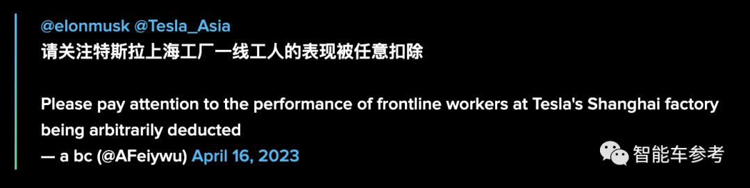 还有人在推特上艾特马斯克,希望马斯克能注意特斯拉上海工厂一线工人的绩效被任意扣除。(现在这位用户的推特已清空。)