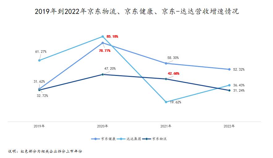 为全面评估京东系上市公司的成长性,我们将达达、京东健康、京东物流上市前后的业绩进行对比,虽然三家企业业绩均实现了正向增长,但京东健康的增速最快,京东物流整体表现相对平稳,达达业绩整体业绩波动性较大。