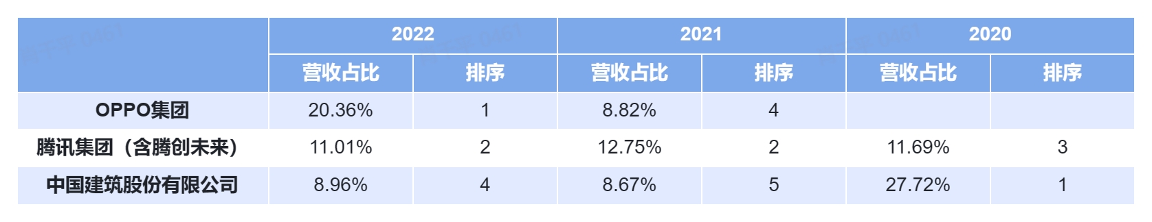 在宏业基2022年前五大客户中,OPPO集团以2.5亿元占20%;腾讯集团贡献1.3亿元,占比11%;京东紧随其后,以1.2亿元占10%。招股书显示,宏业基与OPPO、腾讯的合作关系在2019年既已通过邀请招标达成。