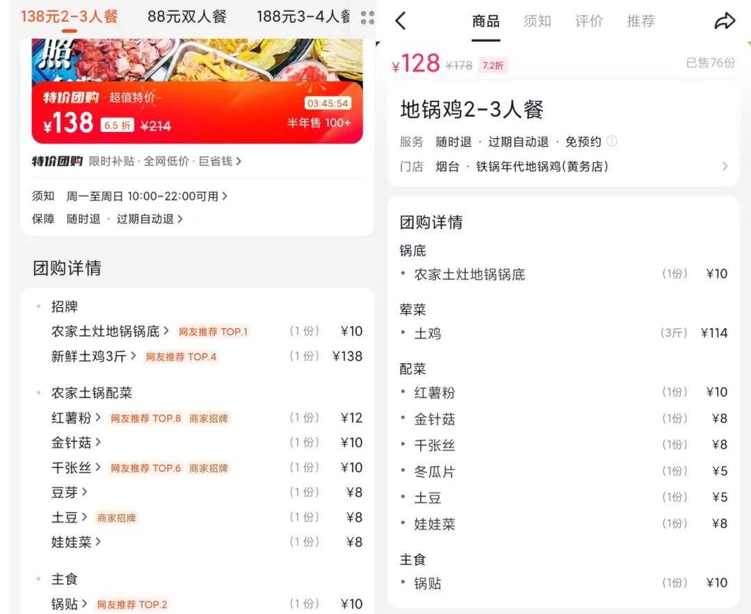 比如皖北地锅鸡烟台某店,其美团有7个团购,抖音有8个,其中相同的双人餐和三人餐套餐,抖音比美团便宜10元。