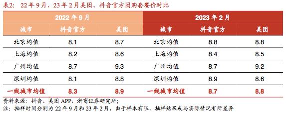 浙商证券在今年3月发布的《美团深度报告:外卖无虞,到店竞争边际趋缓》也印证了这一点,其对比去年9月和今年2月的抽样数据发现,抖音美团的团购价差在收窄,抖音:美团折扣率从8.3:8.9收窄至8.7:8.8。