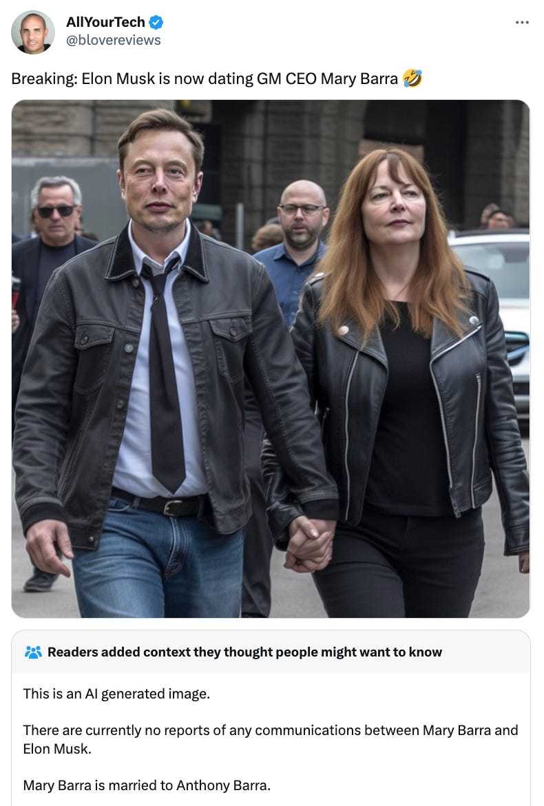 虚假信息与 AI 生成的内容也将是社交平台的责任——看这张(假)图片下的 Twitter 免责声明: