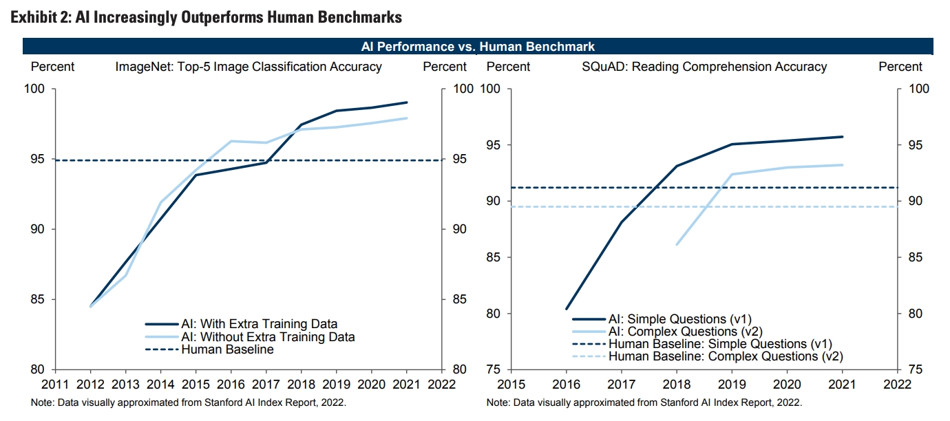 自动化源于这样一个事实,也就是人工智能在之前唯有人类才能干的事情上的表现比人类还要出色了。下图是人工智能与人类在图像分类与阅读理解方面的对比,其中实线为人工智能,虚线为人类:
